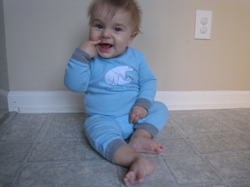 His motor skills are really developing, especially for someone who was in a cast for three months. He’s got an amazing throwing arm; he throws balls better than Henry does. And now, six weeks out of his cast, he is finally crawling on all fours!! (He has been dragging himself around, quite speedily, while he had the cast and since then.) He is also pulling up to stand on everything and crawling over everything. This morning he climbed up to the fifth stair for the first time ever!